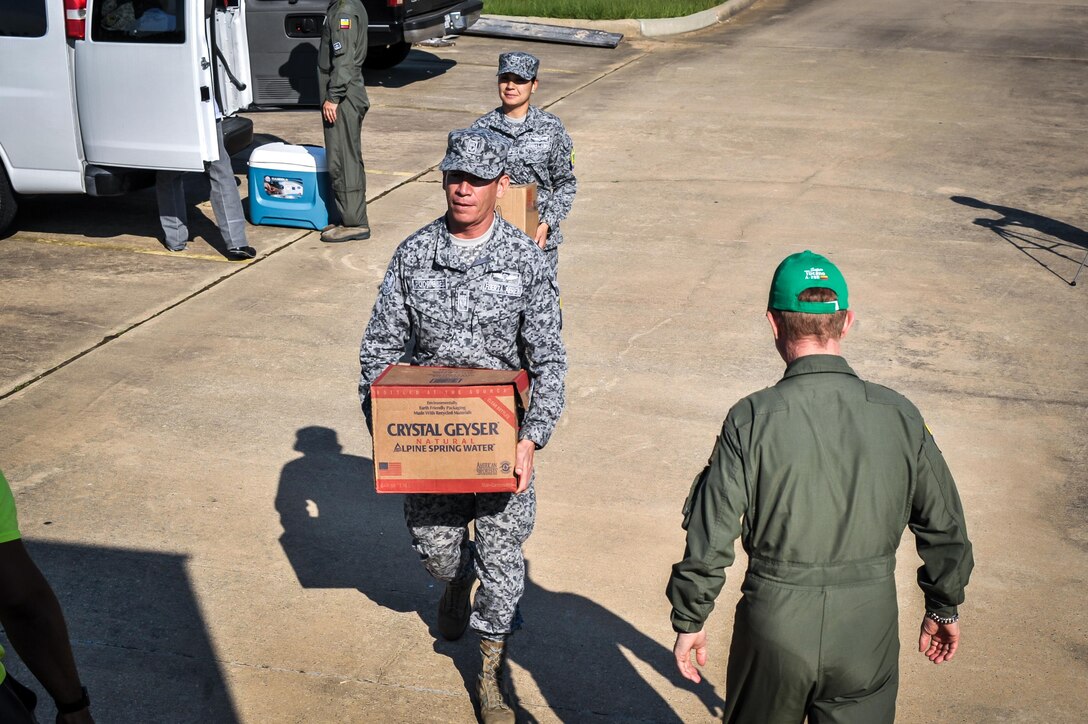 Colombian Airmen haul supplies to an awaiting Salvation Army truck in Bossier City, La., Aug. 27, 2016. Colombian Airmen visiting Barksdale Air Force Base, La., donated supplies to the local Salvation Army for delivery to relief centers in central Louisiana following weeks of torrential rain and flooding in the region. (U.S. Air Force photo / Senior Airman Mozer O. Da Cunha)