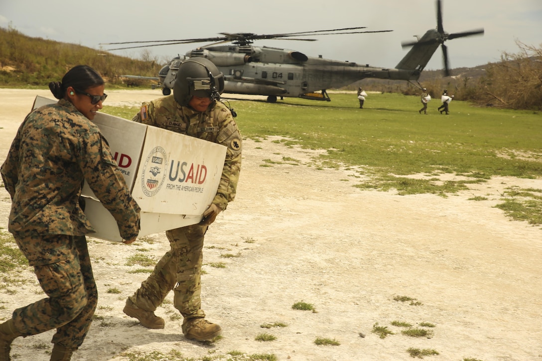 U.S. Marine Sgt. Elena Moreno, a heavy equipment operator with Marine Wing Support Detachment 31, attached to Special Purpose Marine Air-Ground Task Force - Southern Command, and U.S. Army Sgt. King David, a crew chief with Joint Task Force-Bravo, 1st Battalion, 228th Aviation Regiment, unload emergency supplies at a distribution point in Jeremie, Haiti, Oct. 9, 2016. The Marines with SPMAGTF-SC and soldiers with JTF-Bravo are part of Joint Task Force Matthew, a U.S. Southern Command-directed team deployed to Port-au-Prince at the request of the Government of Haiti, on a mission to provide humanitarian and disaster relief assistance in the aftermath of Hurricane Matthew. (U.S. Marine Corps photo by Cpl. Samuel Guerra)