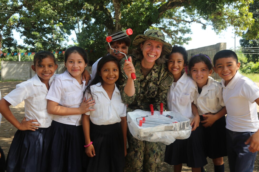 TOCOA, Honduras (August 17, 2017) Cmdr. Rhonda Lizewski, a preventive medicine doctor assigned to the Navy and Marine Corps Public Health Center, poses with students at Claudia Barrera Elementary School, during a Southern Partnership Station 17 community relations project (COMREL). SPS 17 is a U.S. Navy deployment executed by U.S. Naval Forces Southern Command/U.S. 4th Fleet, focused on subject matter expert exchanges with partner nation militaries and security forces in Central and South America. (U.S. Army photo by SPC Judge Jones/Released)