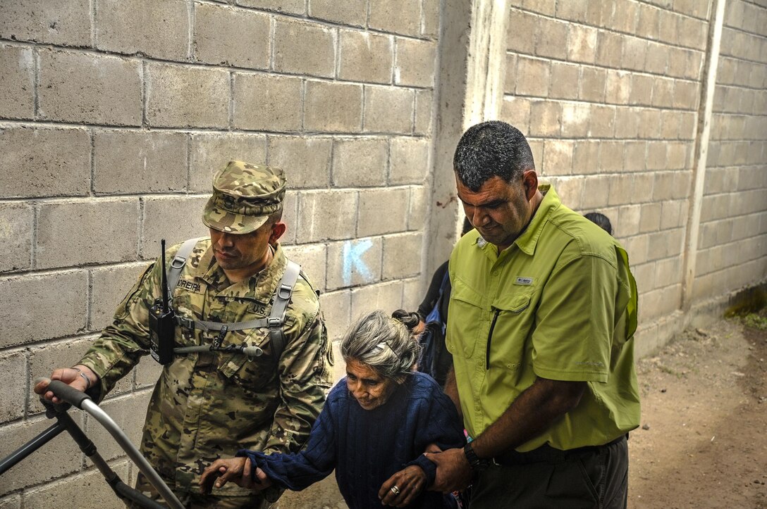 U.S. Army Master Sgt. Eduardo Moreira (left), Joint Task Force-Bravo Medical Element, and Mr. Jaime Morales (right) assist a Honduran woman attending a Medical Readiness Training Exercise in Duyure, in the Choluteca Department, Honduras, Oct. 27, 2017. MEDEL and the Honduran Ministry of Health