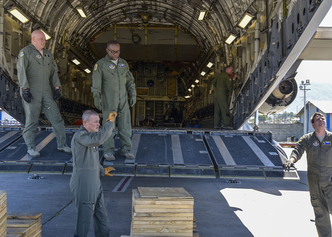 PORT-AU PRINCE, HAITI – 315th Airlift Wing Reservists offload humanitarian cargo from a Charleston C-17 Globemaster III in Port-au Prince, Haiti Feb. 3, 2018. The Reservists delivered nearly 100,000 pounds of humanitarian aid to Haiti. The missions involved two C-17 Globemaster III aircraft delivering donated supplies and a well-drilling truck. (U.S. Air Force Photo by Maj. Wayne Capps)