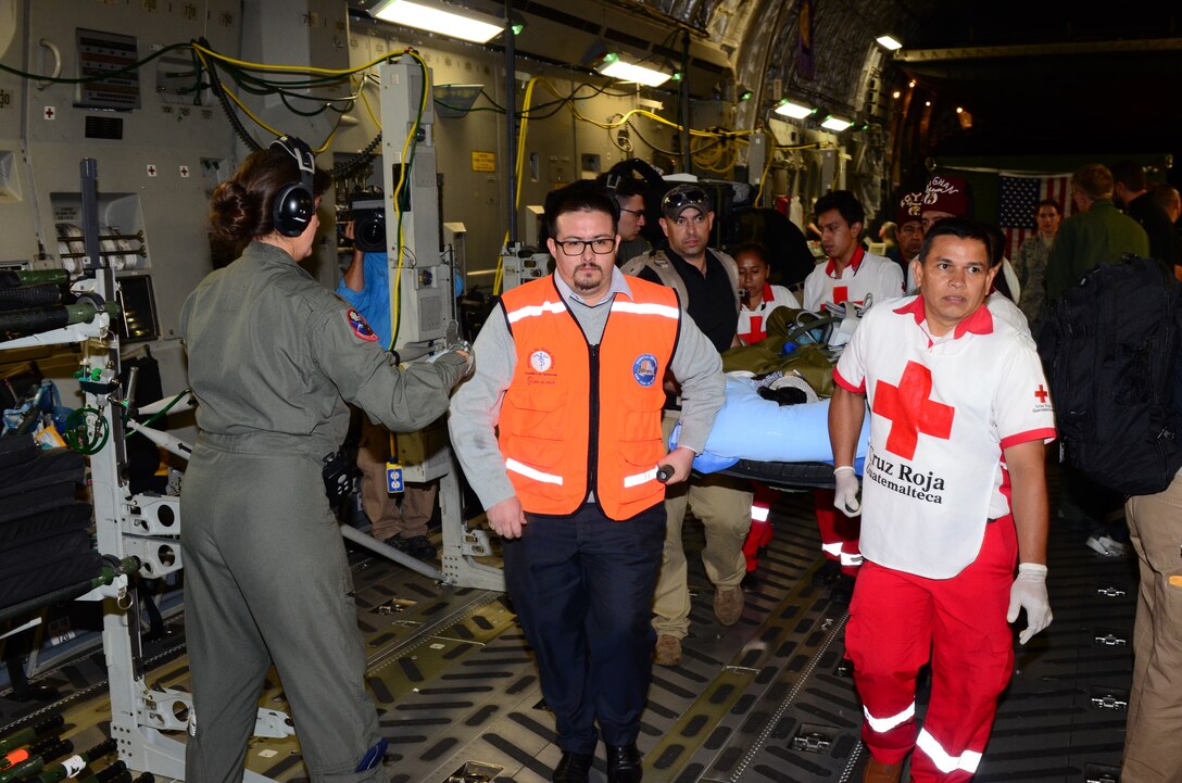 A joint medical team from the Mississippi Air National Guard’s 183rd Air Evacuation Squadron and Joint Base San Antonio, Texas, assists members of the Guatemalan government with loading critically injured patients on a Mississippi ANG's 172nd Airlift Wing C-17 Globemaster III at Guatemala June 6, 2018. The humanitarian airlift aeromedical evacuation mission was conducted at the direction of U.S. Southern Command to assist the government of Guatemala following the recent eruption of Fuego Volcano. (U.S. Air National Guard photo by Tech. Sgt. Edward Staton)