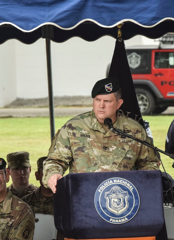 U.S. Army Col. Brian Greata, deputy commanding officer of Special Operations Command South speaks during the Fuerzas Comando opening ceremony July 16, 2018, at the Instituto Superior Policial, Panama. Fuerzas Comando is an annual multinational special operations forces skills competition sponsored by U.S. Southern Command and hosted this year by the Ministry of Public Security, Panama. Through friendly competition, this exercise promotes interoperability, military-to-military relationships, increases training knowledge, and improves regional security. (U.S. Army Photo by Staff Sgt. Brian Ragin/Released)