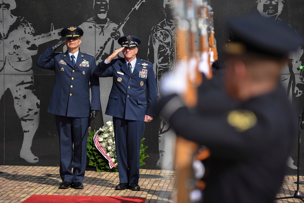 Air Force Chief of Staff Gen. David L. Goldfein and Commander of the Colombian Air Force General Carlos Eduardo Bueno Vargas render salutes during a ceremony at the Memorial Heroes Caidos en Combate in Bogota, Colombia, Nov. 15, 2018. During the ceremony, which took place during his visit to the country Nov. 14-15, Goldfein laid a wreath to honor Colombian troops lost in battle. (U.S. Air Force photo by Tech Sgt. Anthony Nelson Jr.)