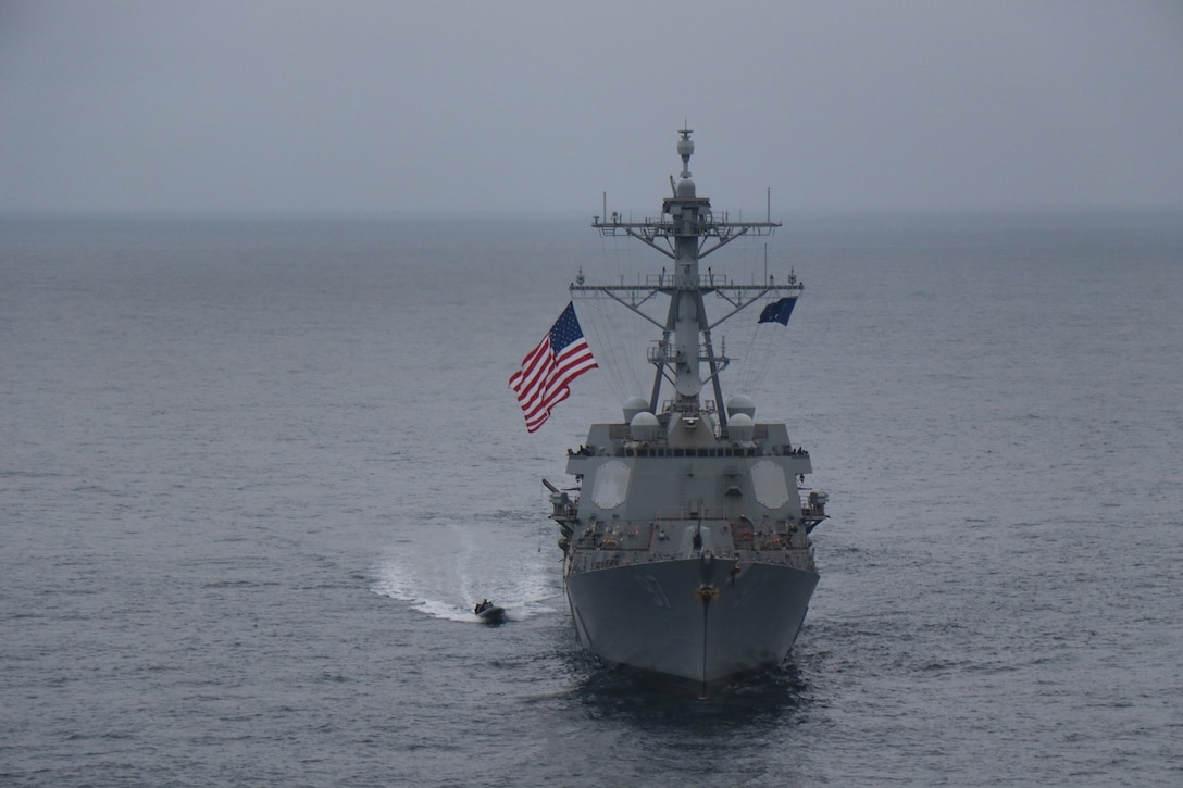 PACIFIC OCEAN (July 11, 2020) A rigid-hull inflatable boat (RHIB) comes alongside the Arleigh Burke-class guided missile destroyer USS Halsey (DDG 97) during a passing exercise (PASSEX) with the Ecuadorian Navy July 11, 2020. Halsey is deployed to the U.S. Southern Command area of responsibility to support Joint Interagency Task Force South’s mission, which includes counter illicit drug trafficking in the Caribbean and Eastern Pacific. (U.S. Navy photo by Naval Aircrewman 2nd Class Timothy Boos /Released)