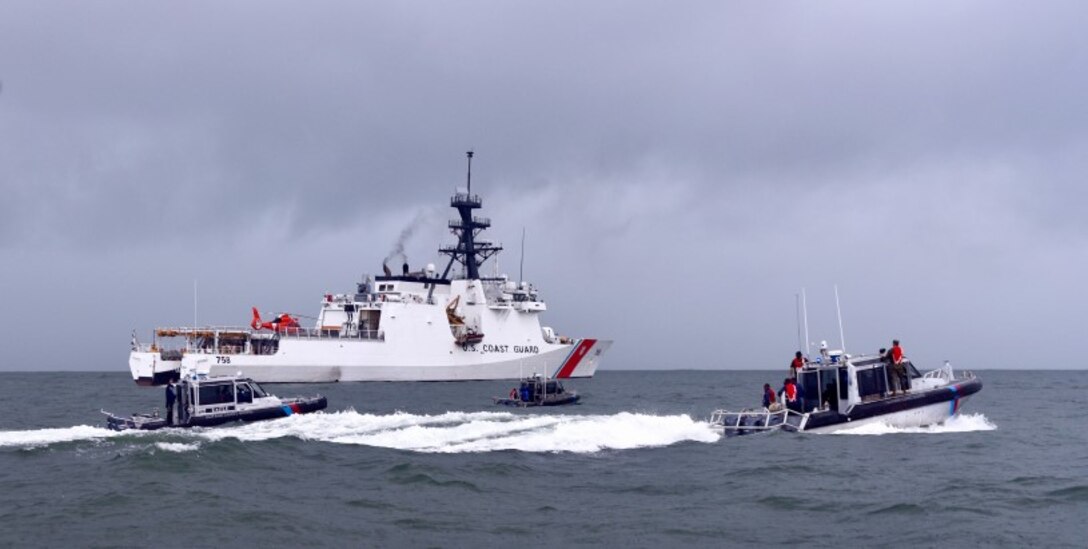 Guyana coast guard small boats patrol alongside the USCGC Stone (WMSL 758) off Guyana's coast on Jan. 9, 2021. The U.S. and Guyana governments enacted a bilateral agreement on Sep. 18, 2020, to cooperatively combat illegal marine activity in Guyana’s waters. (U.S. Coast Guard photo by Petty Officer 3rd Class John Hightower)