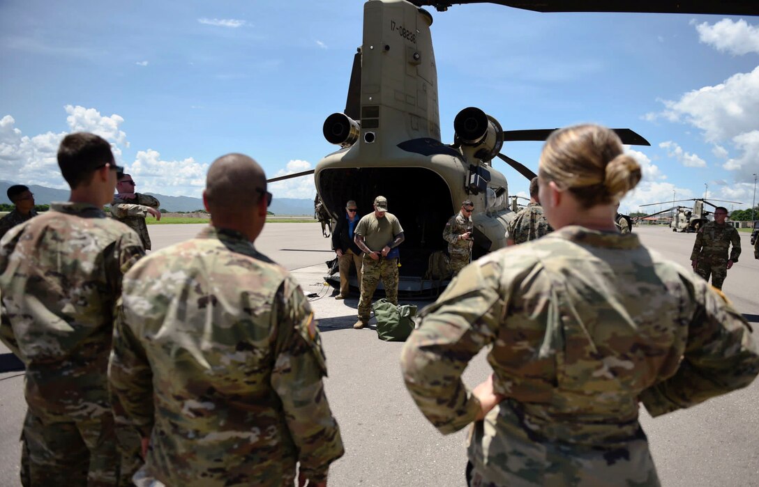 Service members with Joint Task Force-Bravo prepare to depart for Haiti in support of disaster relief efforts after a 7.2 magnitude earthquake devastated the region, at Soto Cano Air Base, Aug 15. At the request of U.S. Southern Command, assets with the 1st Battalion, 228th Aviation Regiment, JTF-Bravo will provide heavy and medium lift to support the U.S. Agency for International Development, Bureau of Humanitarian Assistance-led mission to alleviate human suffering and bolster Haitian disaster response capabilities. (U.S. Air Force photo by Capt Annabel Monroe)