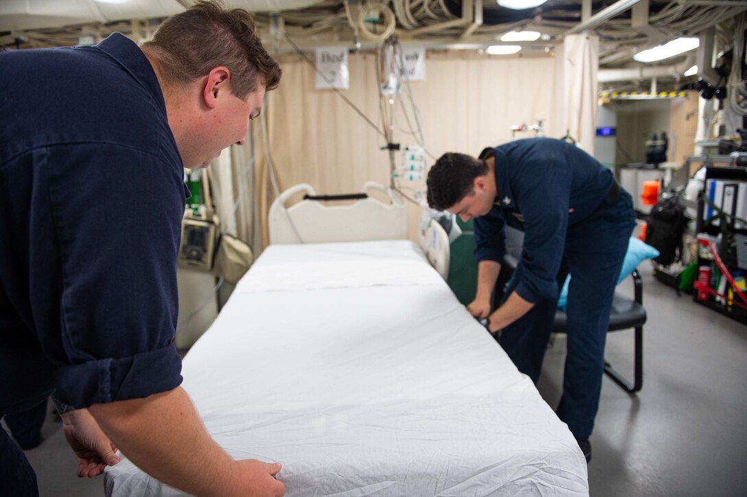 ATLANTIC OCEAN (Aug. 20, 2021) Hospital Corpsman aboard the San Antonio-class amphibious transport dock ship USS Arlington (LPD 24) prepare beds in the medical ward, Aug. 20, 2021. Arlington is deployed to U.S. Naval Forces Southern Command/U.S. 4th Fleet to support humanitarian assistance and disaster relief (HADR) efforts in Haiti following a 7.2-magnitute earthquake on Aug. 14, 2021. (U.S. Navy photo by Mass Communication Specialist 2nd Class Jack D. Aistrup/Released)