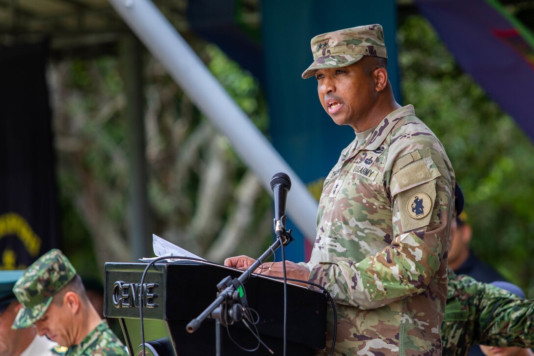 Maj. Gen. William Thigpen, Commanding General of U.S. Army South, provides remarks during the closing ceremony of Exercise Southern Vanguard 23 at Tolemaida Military Base, Colombia, on Nov. 16, 2022. Exercise Southern Vanguard is U.S. Army South's premier training exercise taking place at the operational and tactical levels intended to increase interoperability between the United States and Western Hemisphere forces. This year's iteration, Exercise Southern Vanguard 23, involves Soldiers from U.S. Army South and the U.S. Army National Guard training alongside Colombian Army soldiers in varying terrain while conducting weapon familiarization lanes culminating in a bilateral military training operation.