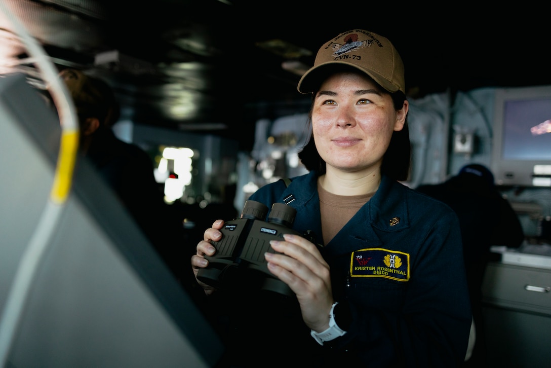ATLANTIC OCEAN (May 10, 2024) Lt. Kristen Rosenthal, from Fresno, California, assigned to legal department as the disciplinary officer, stands junior officer of the watch on the bridge of Nimitz-class aircraft carrier USS George Washington (CVN 73) in the Atlantic Ocean, May 10, 2024. George Washington is deployed as part of Southern Seas 2024 which seeks to enhance capability, improve interoperability, and strengthen maritime partnerships with countries throughout the U.S. Southern Command area of responsibility through joint, multinational and interagency exchanges and cooperation. (U.S. Navy photo by Mass Communication Specialist 3rd Class August Clawson)