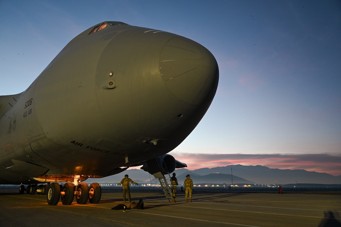 433rd Airlift Wing Citizen Airmen perform pre-flight checks on C-5M Super Galaxy in preparation for a mission supporting Exercise Southern Star ‘25 at Arturo Merino Benitez International Airport in Santiago, Chile, June 1, 2025. (U.S. Air Force photo by Julian Hernandez)